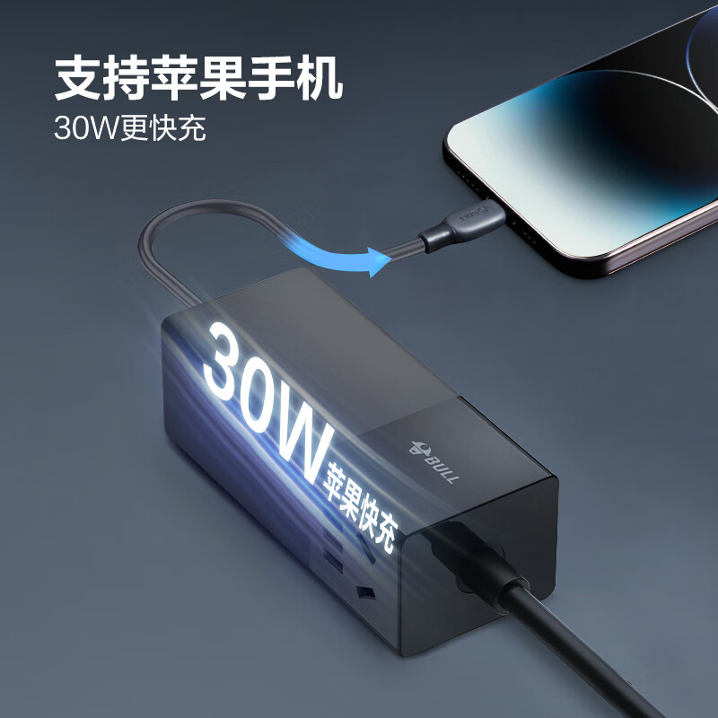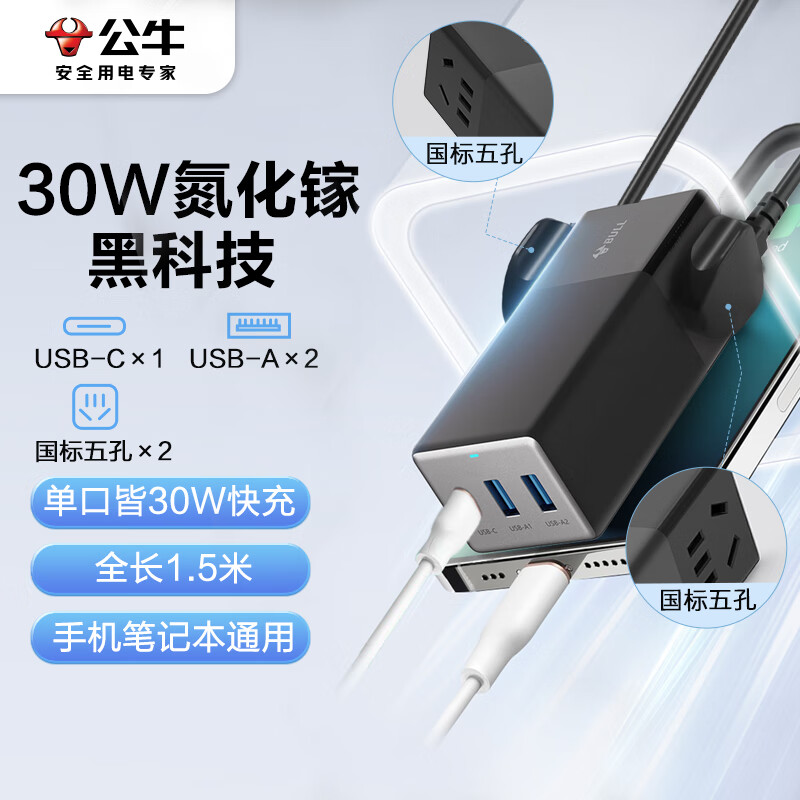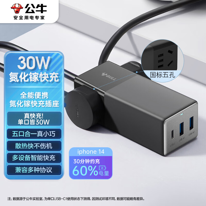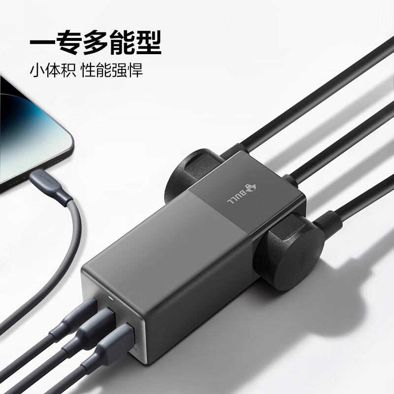 公牛(BULL)氮化镓30W充电器快充笔记本插座/插线板/插排/接线板 小电舱快充 USB(1C2A)+2插孔 灰色价格:100.00元!