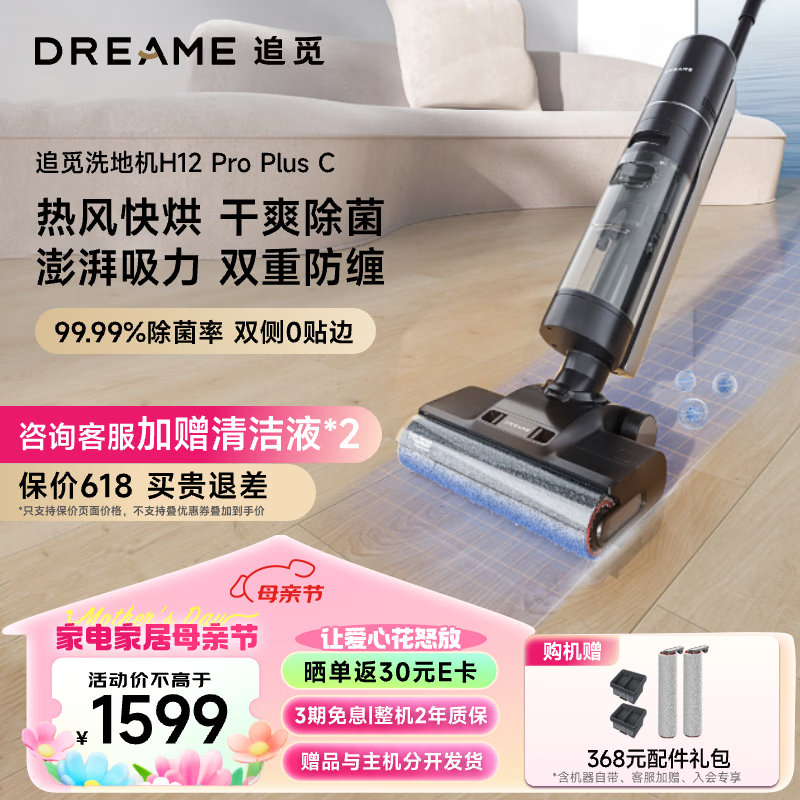 追觅【母亲节礼物】无线智能洗地机H12Pro Plus C家用扫地手持吸尘洗拖一体拖地机 热风烘干价格:1599.00元!