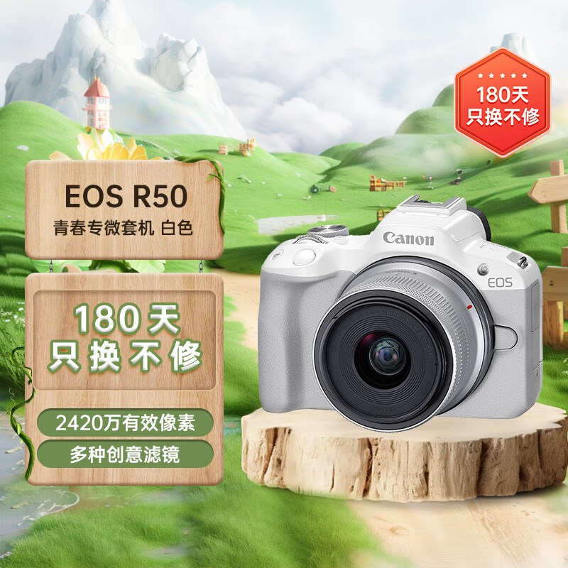 佳能(Canon)EOS R50 小型便携 搭载多种智能化自动拍摄功能 RF-S18-45镜头 微单数码套机 白色价格:6699.00元!
