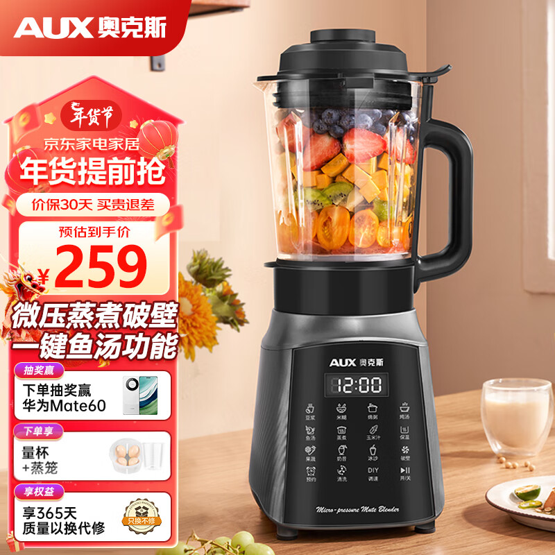 奥克斯(AUX)破壁机家用 低音加热豆浆机多功能料理机榨汁机搅拌辅食机沙冰机果汁机保温智能预约9289A皓月灰价格:259.00元!