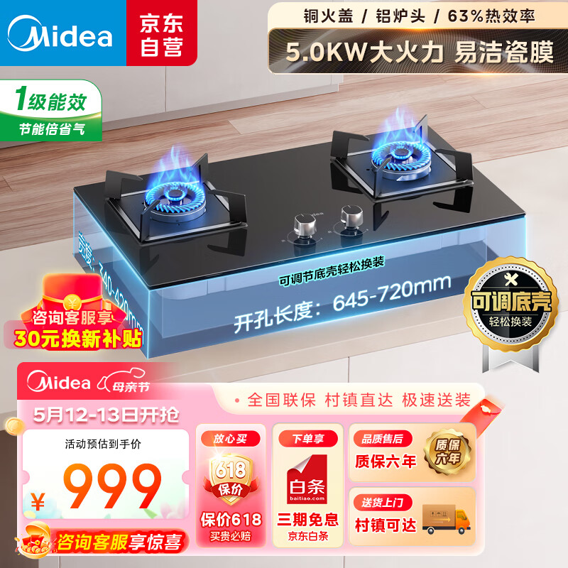 美的(Midea)燃气灶双灶家用5.0KW大火力黑晶宽面板台嵌两用双灶 天然气灶Q330价格:999.00元!