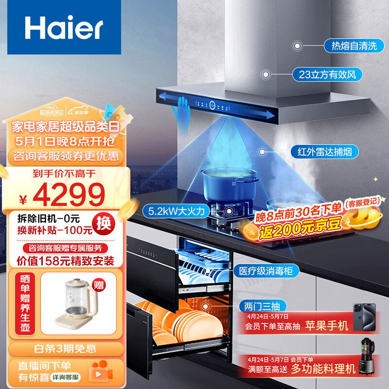 海尔(Haier)抽油烟机 顶吸烟灶消三件套 23m3/min有效风 5.2kw大火力 医疗级消毒 ET931+Q2BE3(天)+E07JU1价格:4299.00元!