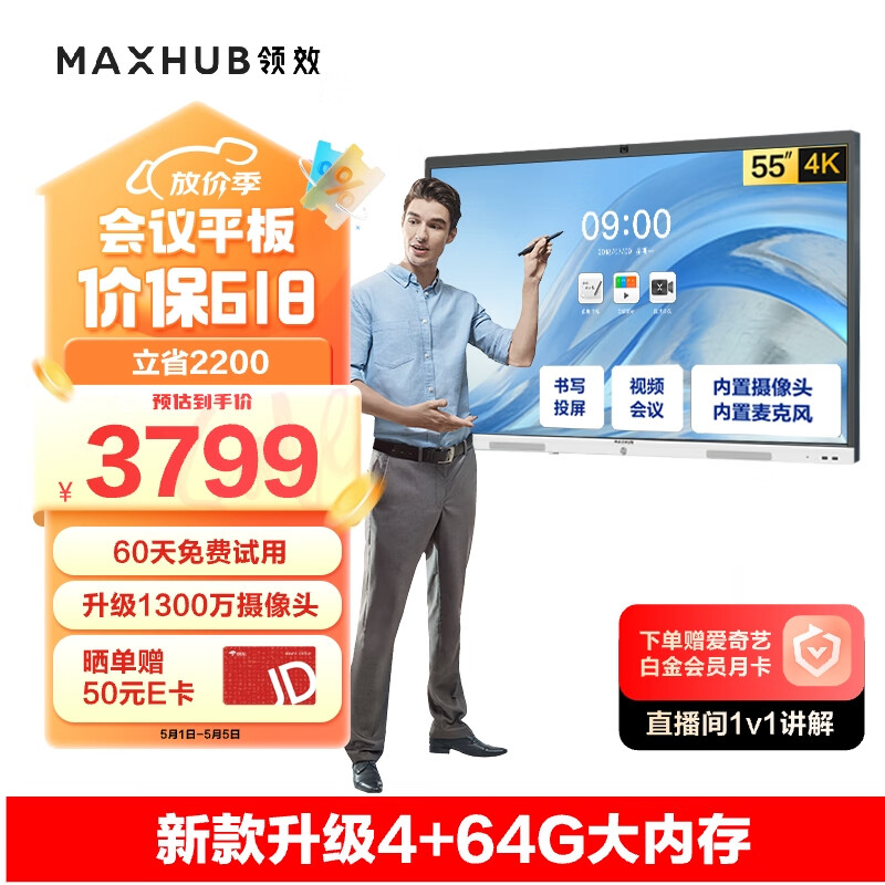 maxhub会议平板V6新锐55英寸触摸视频会议电视一体机 投屏电视智慧屏E55 商用显示 企业智能办公价格:3799.00元!