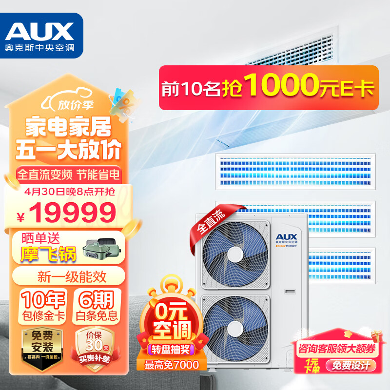 奥克斯(AUX)中央空调5匹一拖三家用多联机 风管机 全直流一级变频包安装嵌入式空调DLR-120W/DCJ2S-JM价格:19999.00元!