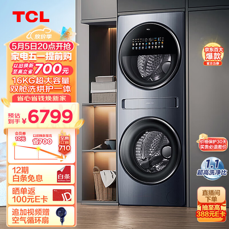TCL 16KG双子舱·复式分区洗衣机Q10 大容量洗烘一体 直驱变频 全自动双滚筒 AI智能投放 G160Q10-HDY价格:6998.00元!