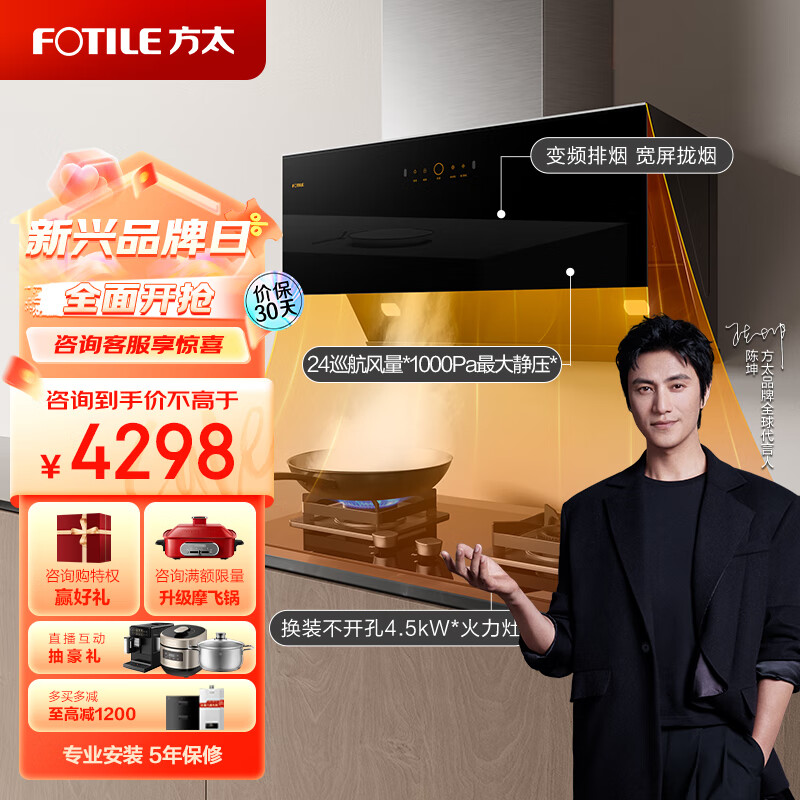 方太(FOTILE)抽吸油烟机灶具套装侧吸变频烟灶24大风量智能巡航挥手智控换装4.5kW双灶JCD16T+02-HT8BE.S天然气价格:4298.00元!
