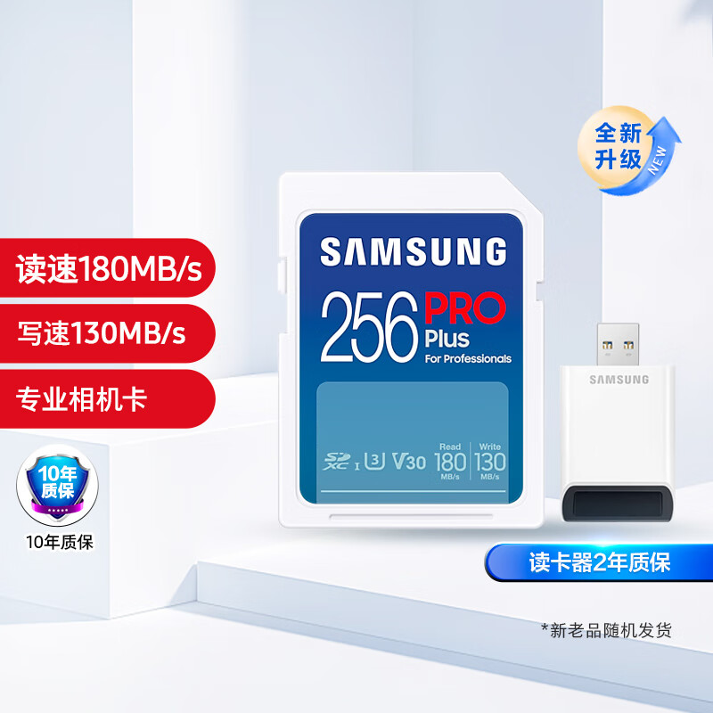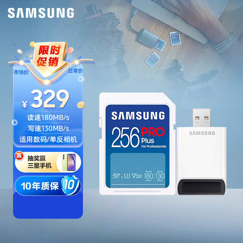 三星(SAMSUNG)256GB SD存储卡套装Pro Plus U3 V30读速180MB/s写速130MB/s高速专业数码相机内存读卡器套装价格:329.00元!