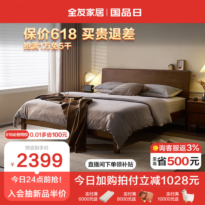 全友家居 轻奢实木功能床可调高床头带置物台双人主卧大床1.8米DW1201价格:3427.14元!