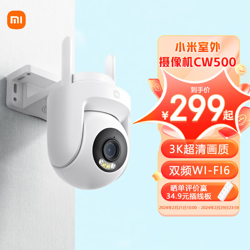 小米室外摄像机CW500 家用监控 双频Wi-Fi6 超清全彩夜视 AI人形/车辆侦测 IP66防尘防水价格:299.00元!