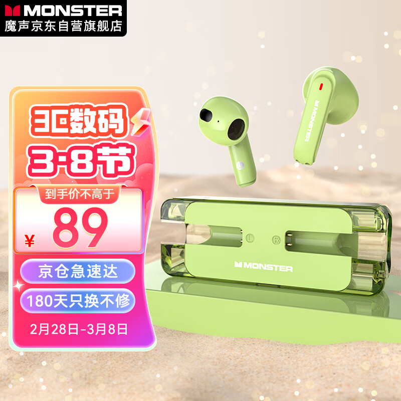 魔声(Monster) XKT08蓝牙耳机真无线智能降噪潮流外观半入耳式耳机通用华为苹果小米手机 绿色价格:119.00元!
