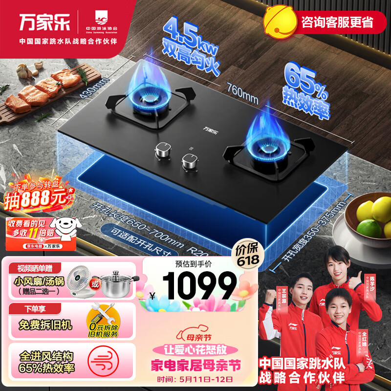 万家乐燃气灶4.5kw大火力 家用嵌入式煤气灶双灶台嵌两用双灶烟灶联动全进风可调节开孔JZY-KV063B液化气价格:1199.00元!