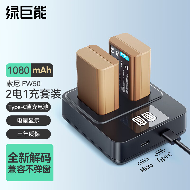 绿巨能(llano)索尼NP-FW50相机电池a6000充电电池a7m2/a6400/a6500/a6300微单相机电池Type-C直充口两电双充价格:219.00元!