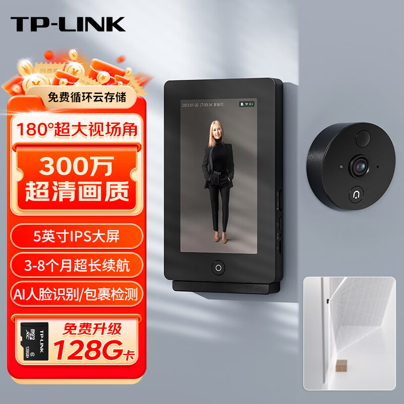 TP-link 智能电子猫眼摄像头可视门铃带显示屏 300万高清家用防盗门口监控无线wifi手机远程视频 DB635A价格:489.00元!