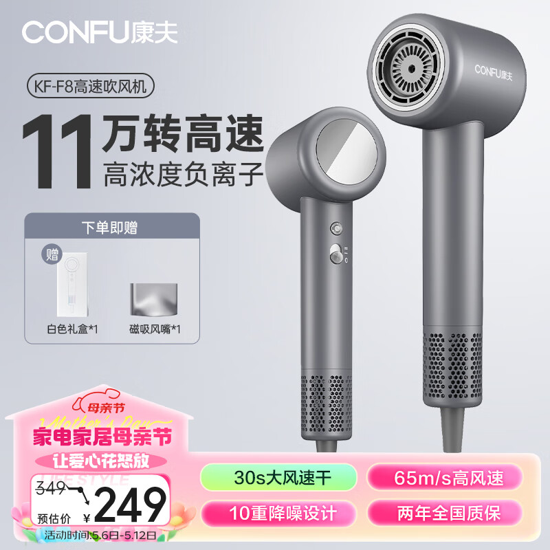 康夫(CONFU)11万转高速电吹风机家用大风力负离子护发送女友生日情人节520礼物吹风筒 KF-F8灰价格:379.00元!