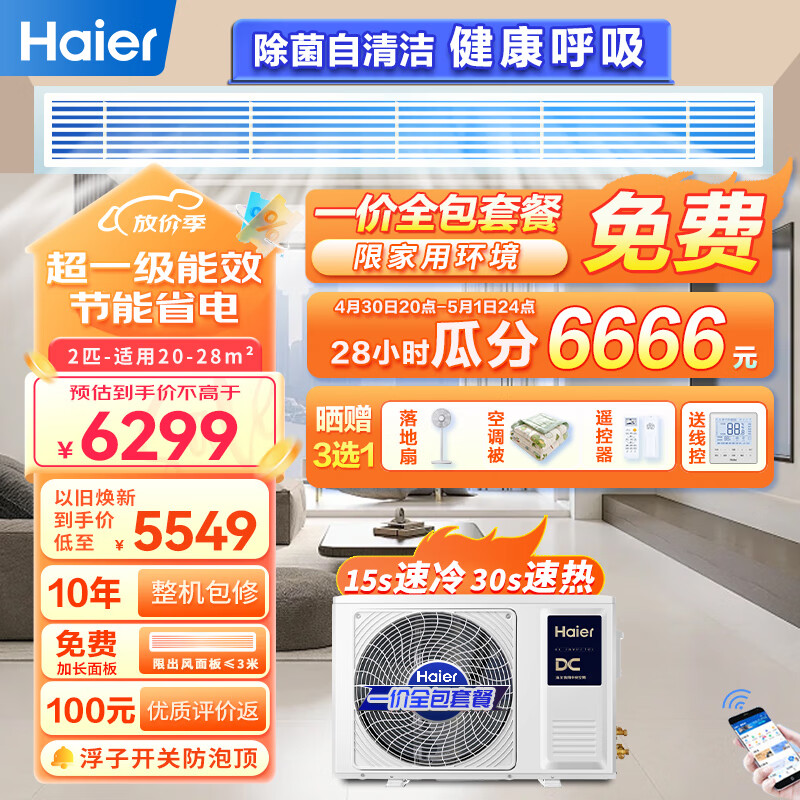 海尔(Haier)中央空调风管机一拖一2匹云璟pro家用2p变频冷暖自清洁全直流新一级能效KFRd-50NW/71EBA81U1价格:6299.00元!