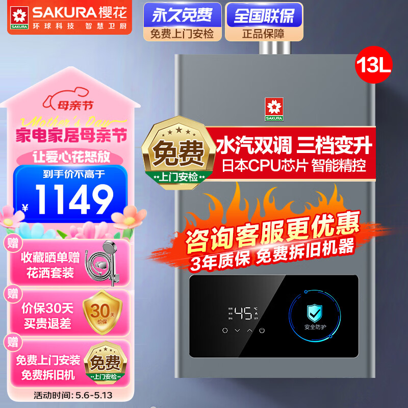 樱花(SAKURA)13升燃气热水器天然气水气双调日本CPU智能精控恒温变频低压启动三档变升多重安防JSQ25-JJP009价格:1149.00元!