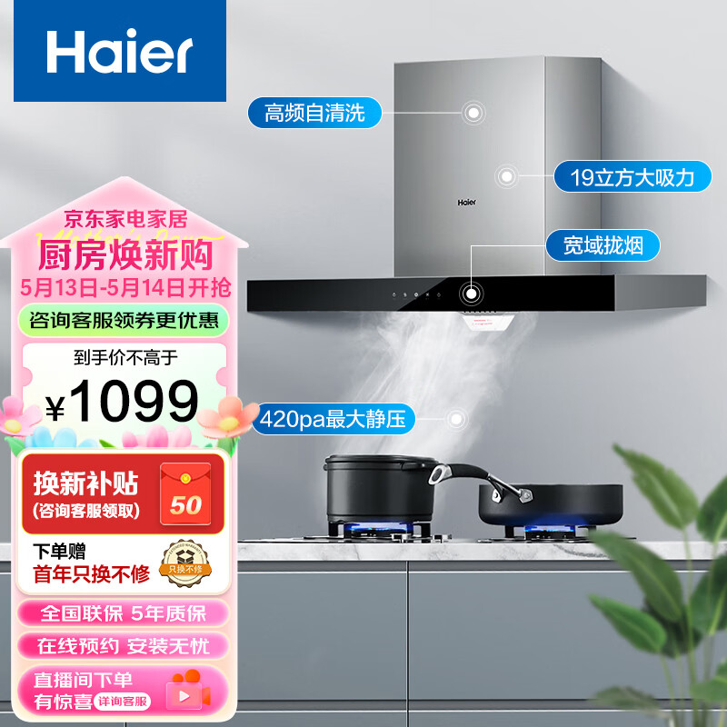 海尔(Haier)抽油烟机 顶吸欧式吸油烟机 420pa大风压 大吸力 自动清洗 以旧换新 厨房家用排烟机T3S价格:1099.00元!