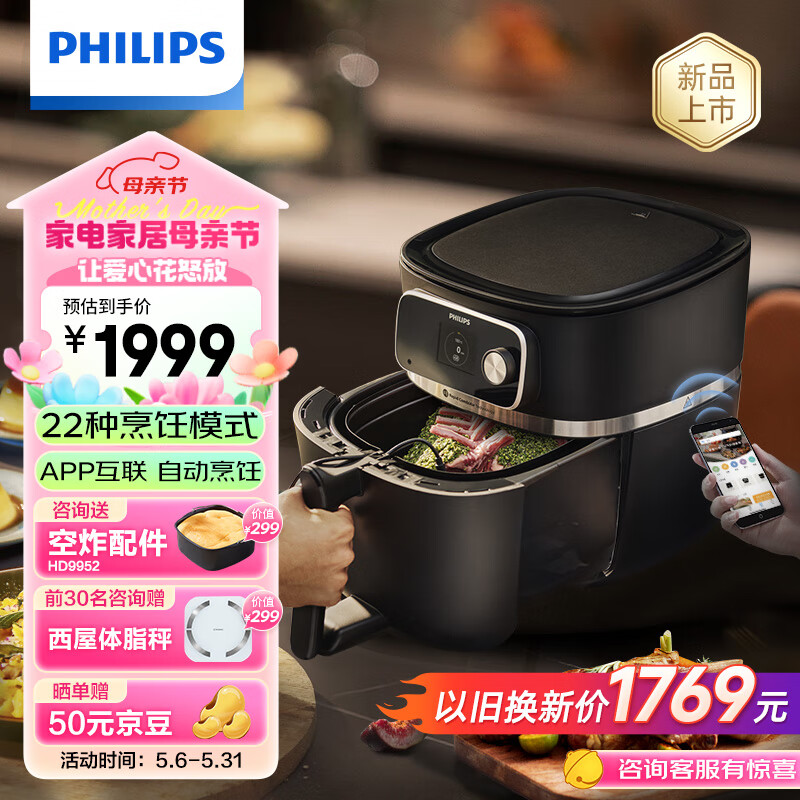 飞利浦(PHILIPS)全新变速空气炸锅8.3L大容量智能烹饪精准控温不用翻面APP智能菜谱多功能烤箱百变空气锅HD9880价格:1999.00元!