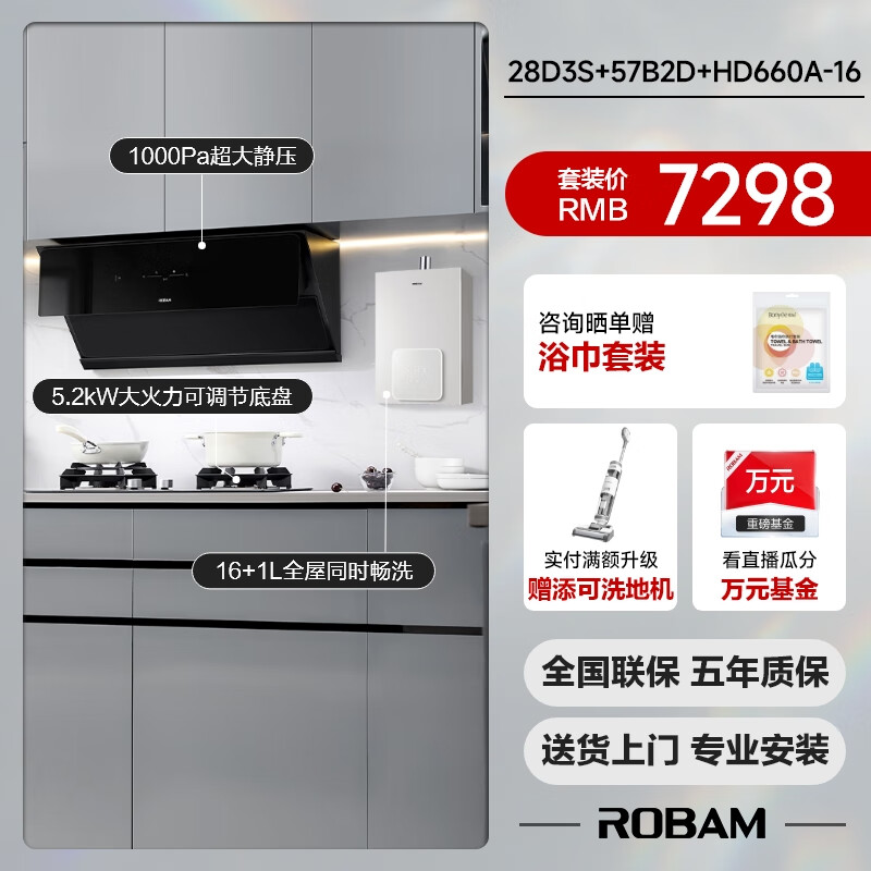 老板(Robam)抽油烟机厨房多件套 侧吸变频23风量烟机燃气灶具17L燃气热水器天然气家用28D3S+57B2DT+HD660A-16价格:7298.00元!