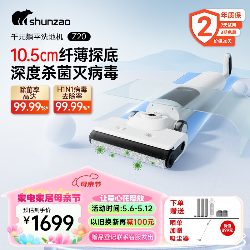 顺造洗地机180度平躺Z20 平拖洗地机洗拖一体自动清洗家用 除菌吸拖一体手持吸尘洗地机价格:1699.00元!