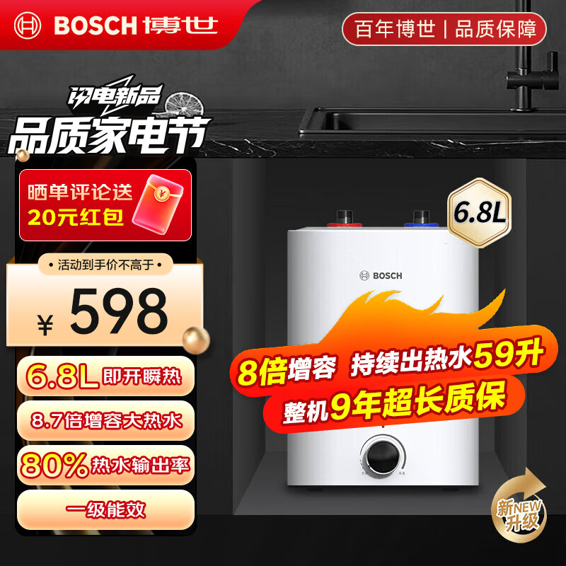 博世(BOSCH) 小厨宝 6.8升迷你电热水器 速热恒温 小尺寸 德国品质 大容量 TR 3100 T 6.8-2 MH价格:598.00元!