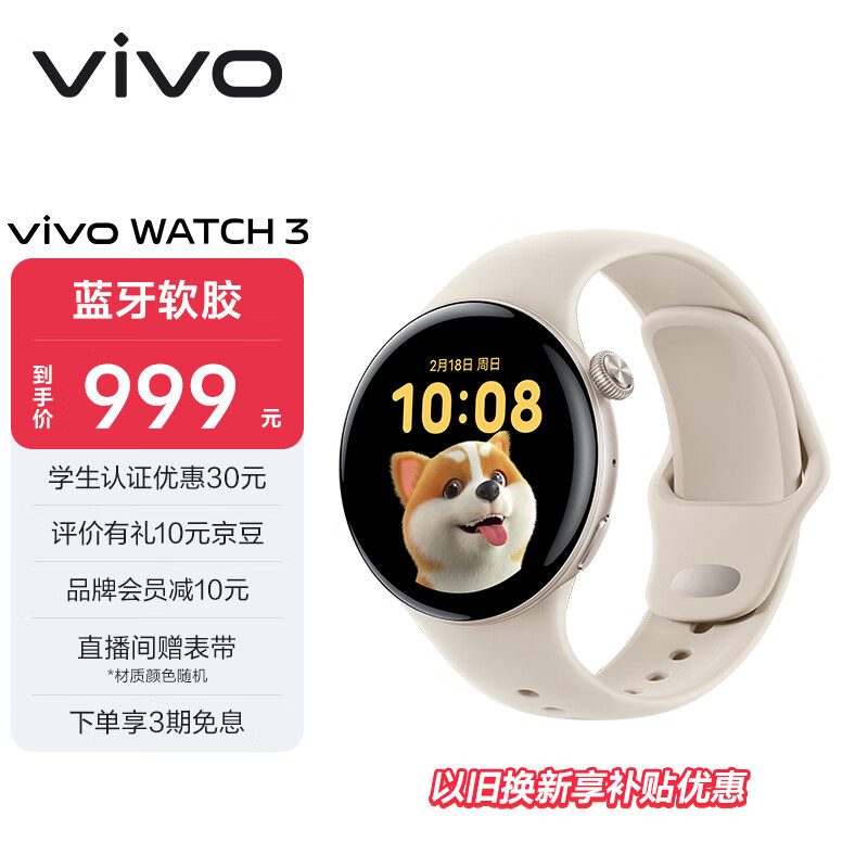 vivo WATCH 3 蓝牙软胶版 月光白 AIGC智能手表表盘 血氧心率监测 自研蓝河系统 超长续航vivowatch价格:999.00元!
