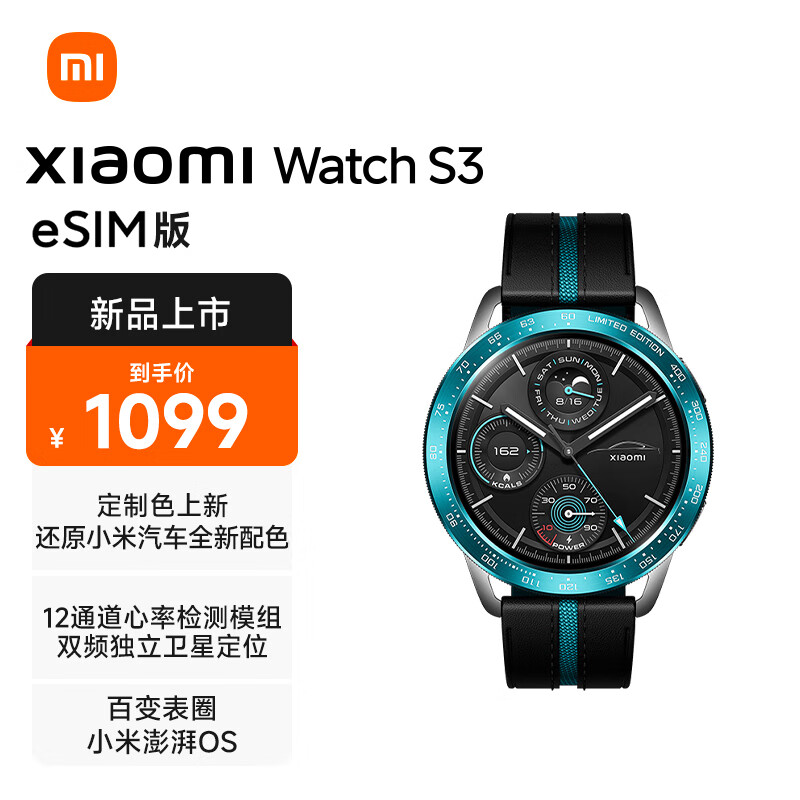 小米(MI)Xiaomi Watch S3 eSIM版 海湾蓝 还原小米汽车全新配色 澎湃OS SU7汽车钥匙 便携可靠价格:1099.00元!