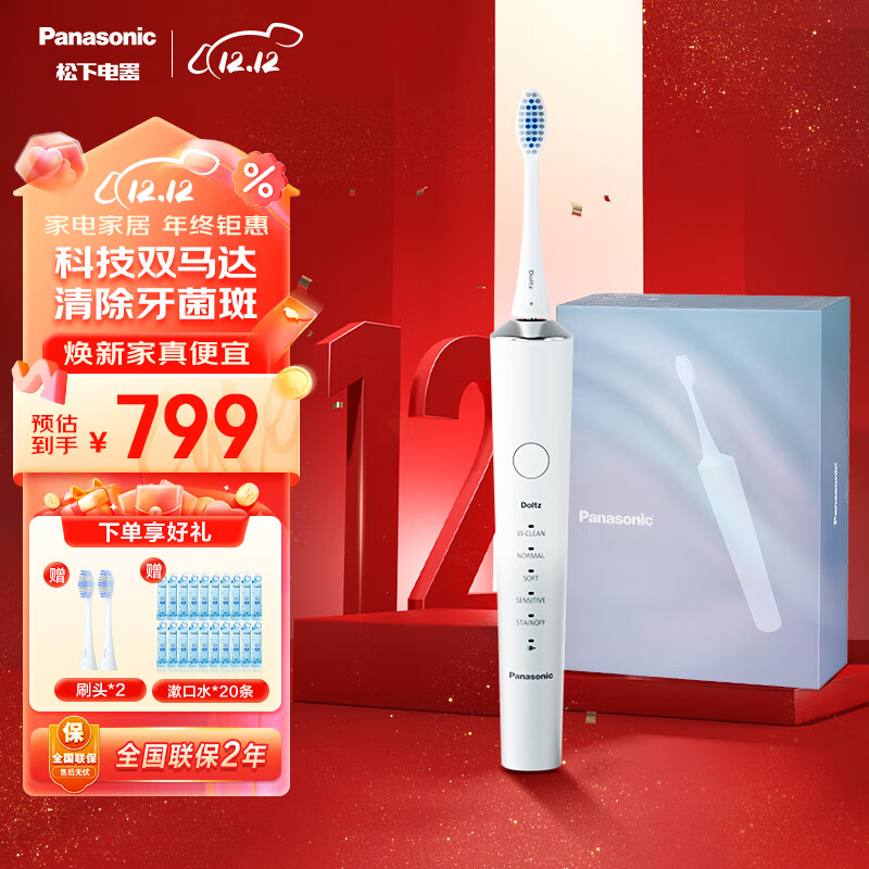 松下(Panasonic)电动牙刷成人科技双马达技术 四向动力 焕光刷情侣礼物 去渍护龈双效清洁 EW-DC70-W 吹雪白价格:919.00元!