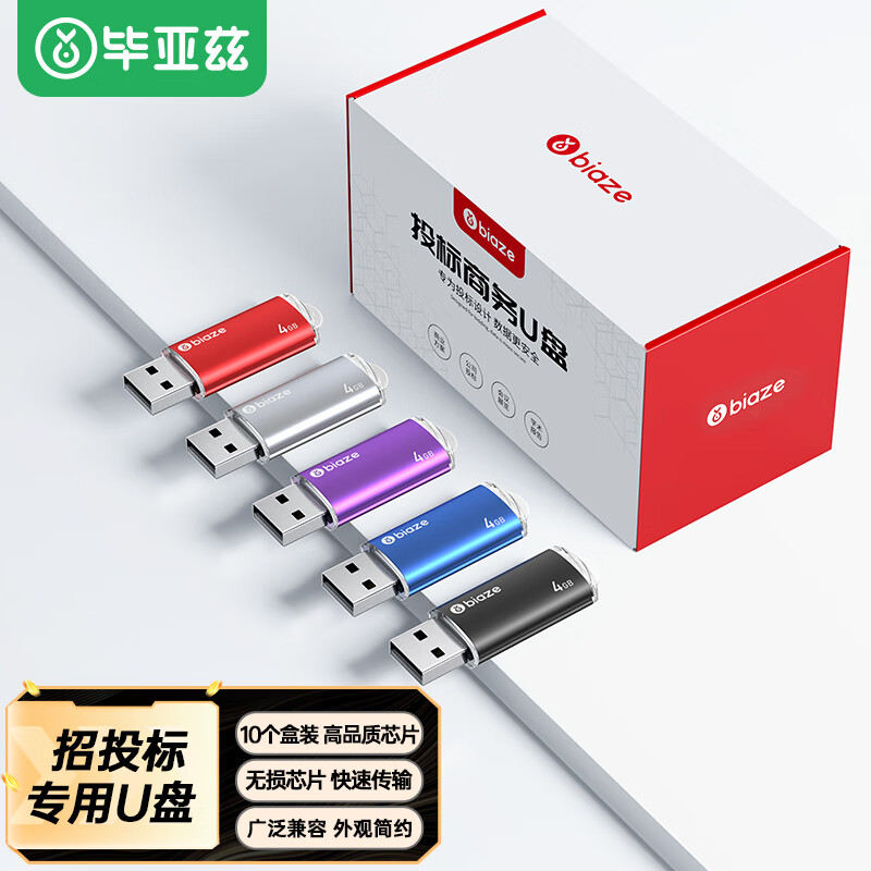 毕亚兹(BIAZE)4GB USB2.0 U盘 UP015 迷你便携 小容量投标优盘 车载U盘 办公学习通用优盘 10个/盒价格:115.00元!