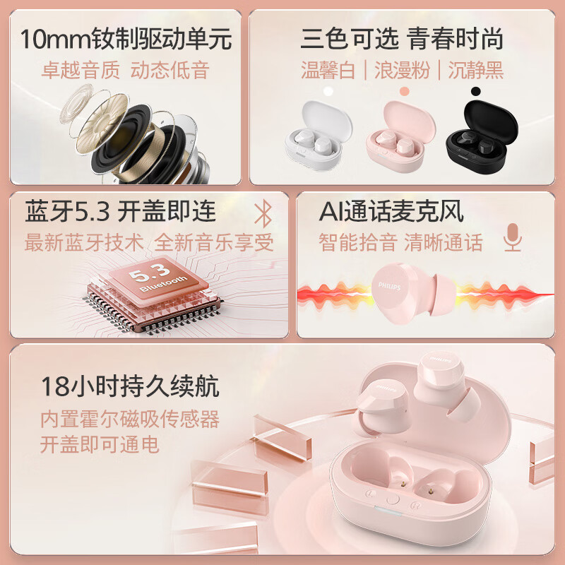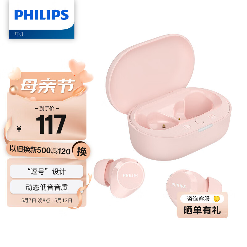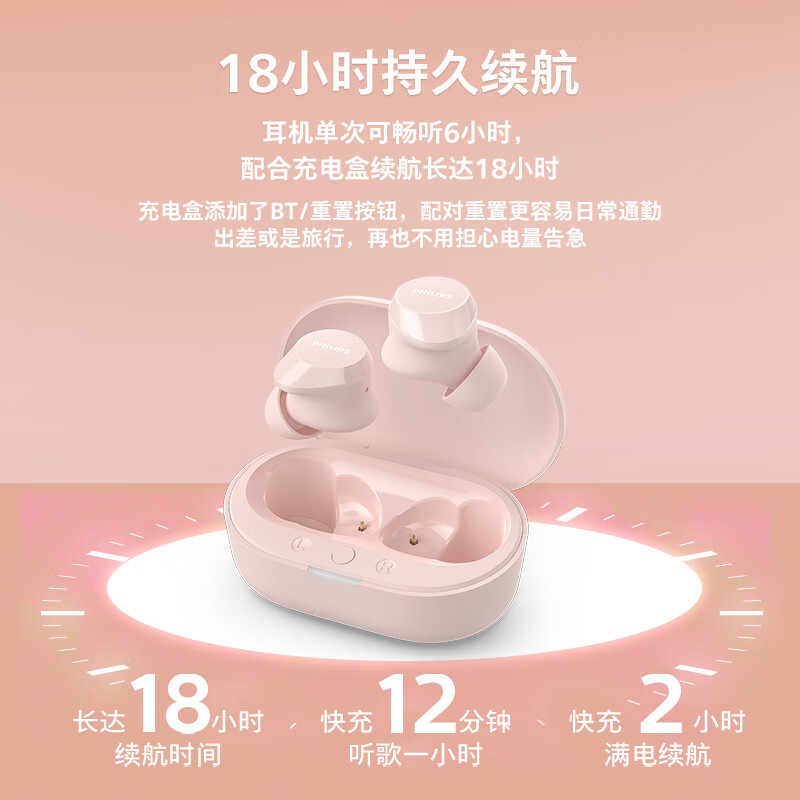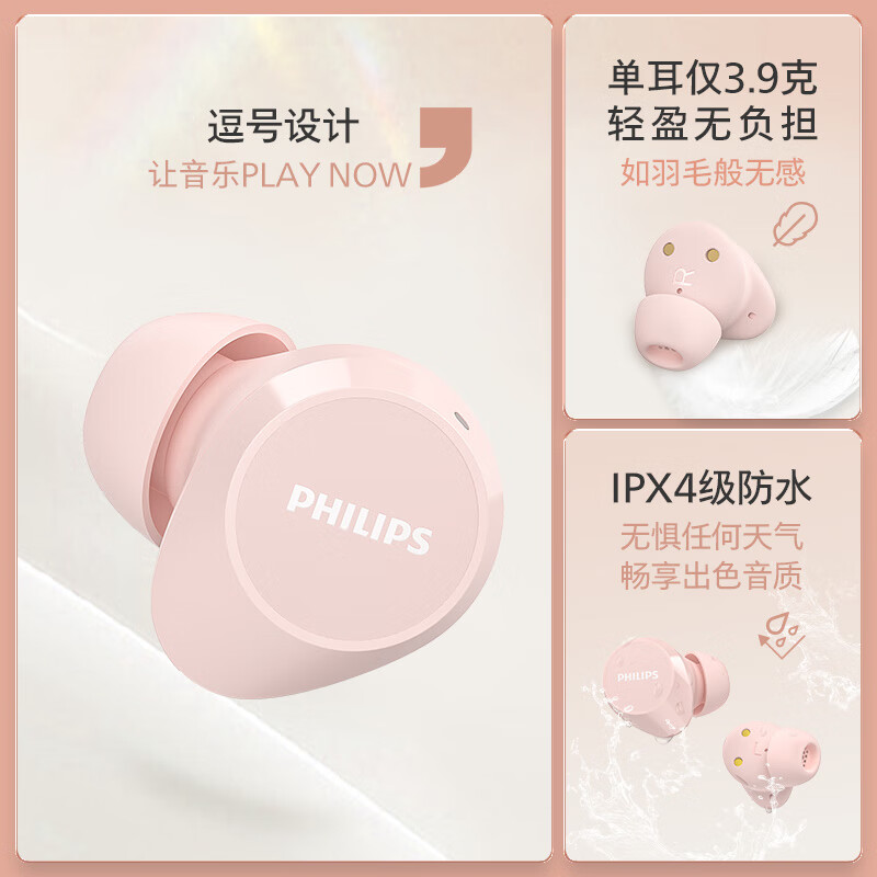 飞利浦(PHILIPS)豆式入耳耳机真无线蓝牙耳机运动耳机游戏耳机回音降噪智能配对苹果华为手机TAT1209粉色价格:117.00元!