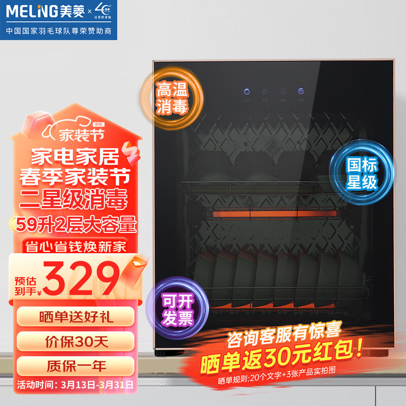 美菱(MeiLing)消毒柜 家用 小型 消毒碗柜 高温立式迷你单门台式桌面餐具茶杯子碗筷厨房消毒机RTD59-50A 价格:329.00元!