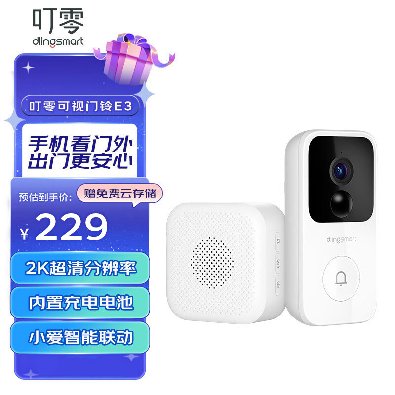 叮零 可视门铃 摄像头家用无线智能门铃300W像素 接入米家APP高清红外夜视 E3套装价格:329.00元!