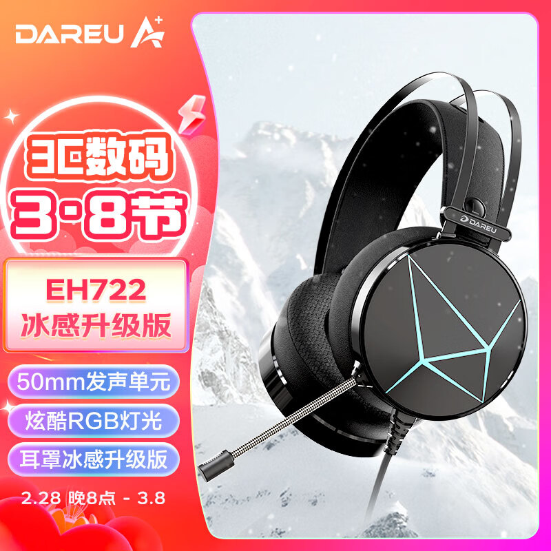 达尔优(dareu) EH722RGB版 游戏耳机usb7.1声道头戴式耳机带麦电脑电竞降噪耳机冰感升级版黑色价格:139.00元!
