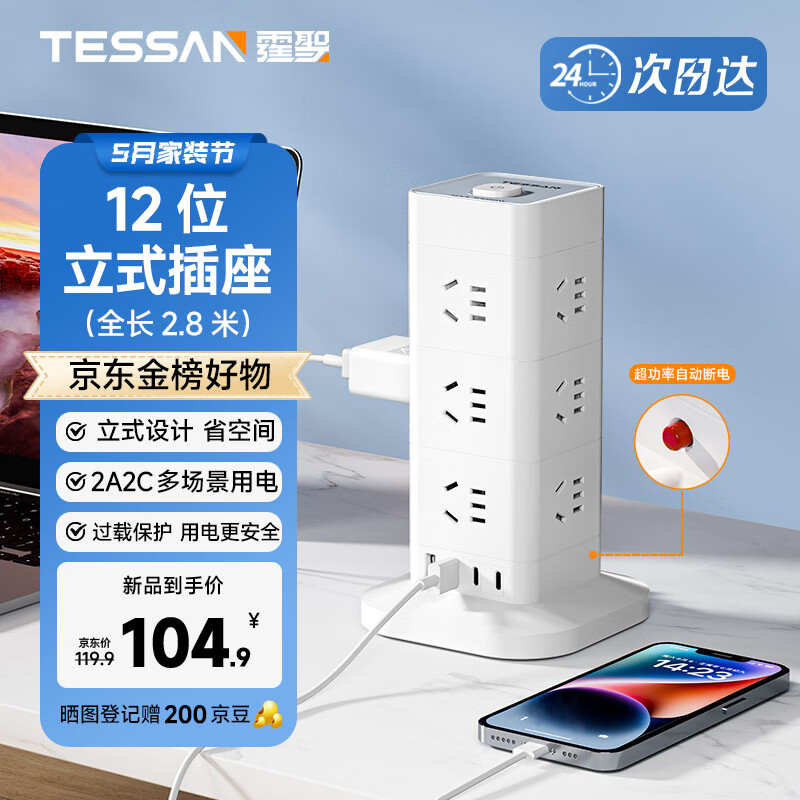 TESSAN霆圣立式插座/插排/排插/插板/接线板/拖线板/总控2.8米 过载保护 12位AC插孔 2USB-A+2TYPE-C价格:109.90元!
