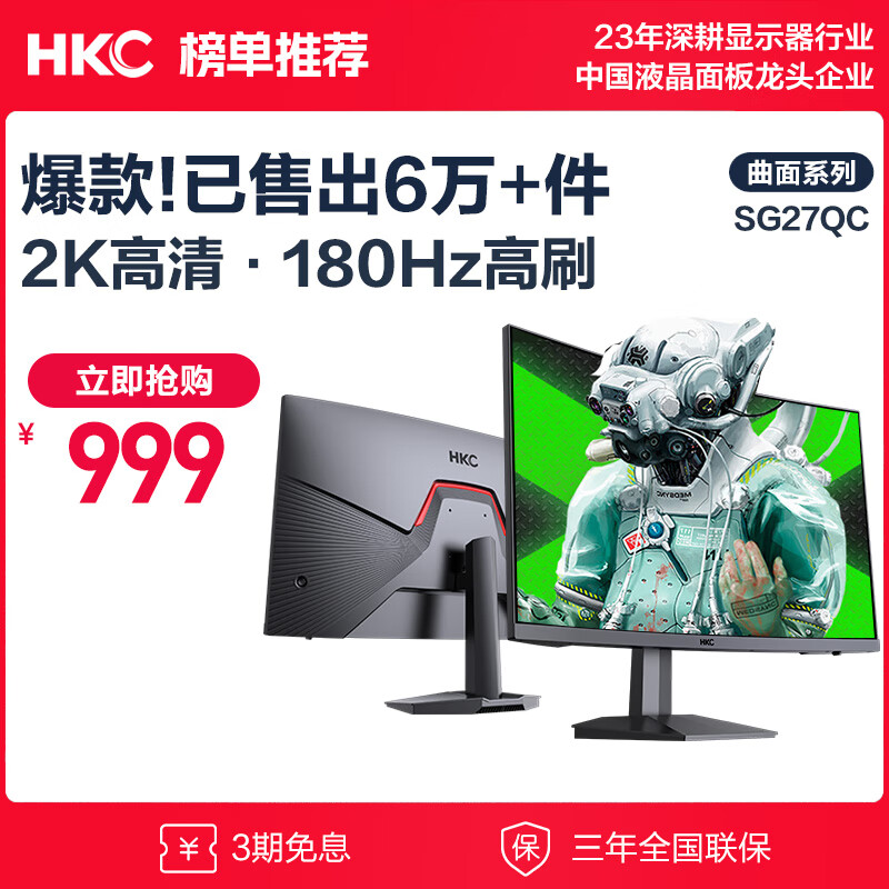 HKC 27英寸2K高清180Hz专业电竞1500R曲面屏幕HVA快速液晶hdmi吃鸡游戏不闪屏网咖电脑显示器SG27QC价格:1149.00元!