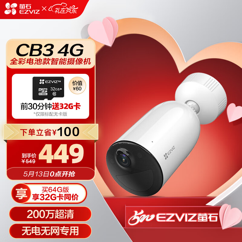 萤石 CB3 4G全彩全无线监控摄像头 200万像素1080P电池相机 内置电信eSIM卡 自带电池 网络摄像机价格:449.00元!