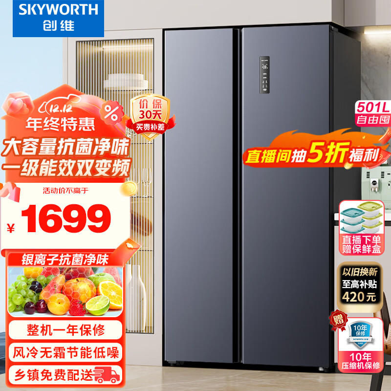创维(SKYWORTH)四维鲜净501升变频一级能效风冷超薄嵌入大容量对开双开门家用电冰箱BCD-501WKPS(N)价格:1699.00元!