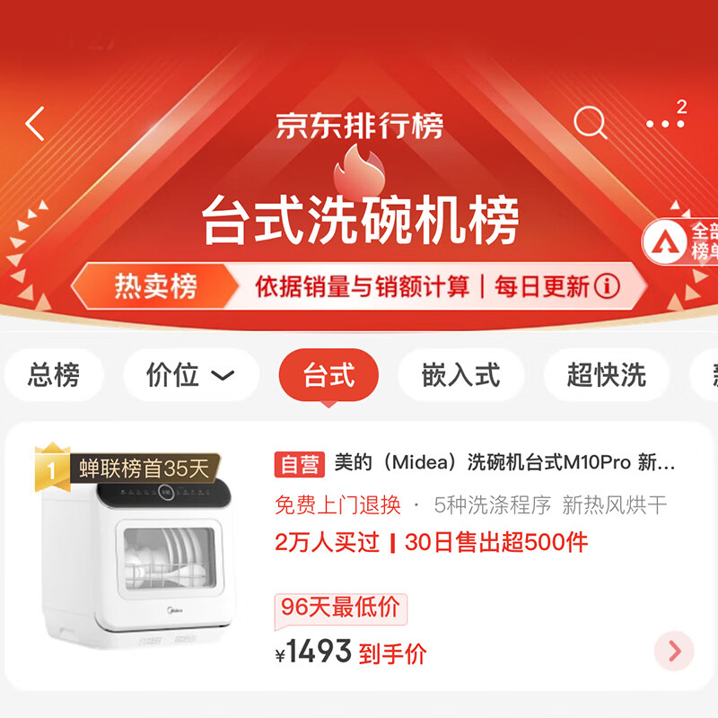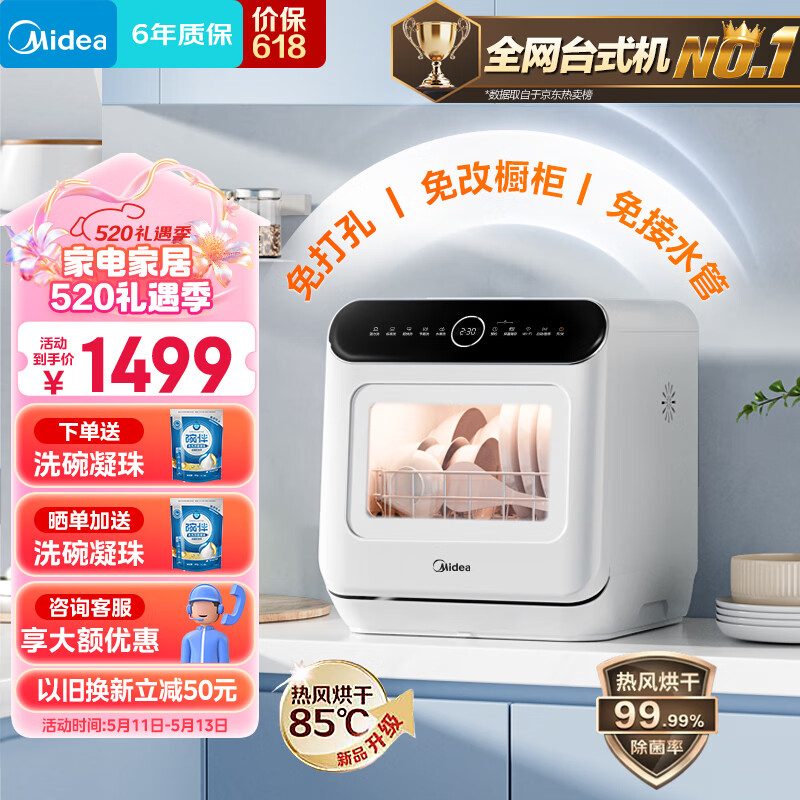 美的(Midea)洗碗机台式M10Pro 新升级85°热风烘干 高温除菌 双层碗篮 海鲜水果洗 家用小尺寸免安装价格:1999.00元!
