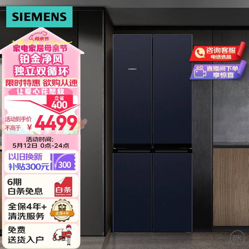 西门子(SIEMENS) 481升混冷无霜双循环十字双开门四开门冰箱铂金净风除味清新湖蕴蓝以旧换新KM49EA56TI价格:4899.00元!