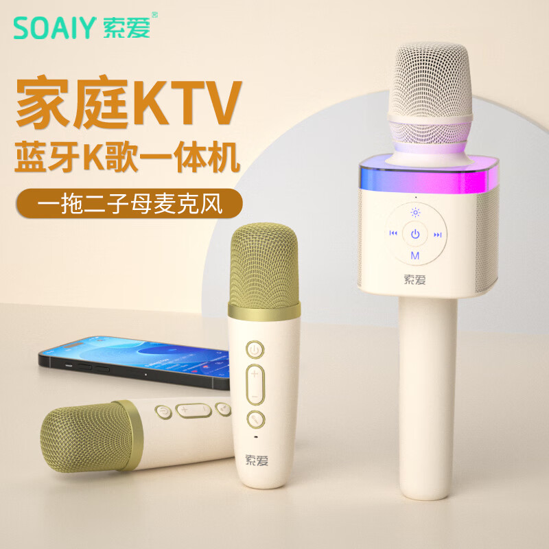 索爱MC62音响一体麦克风唱歌录音声卡拉ok套装k歌宝无线蓝牙儿童话筒家庭ktv一拖二 【油彩白】价格:249.00元!