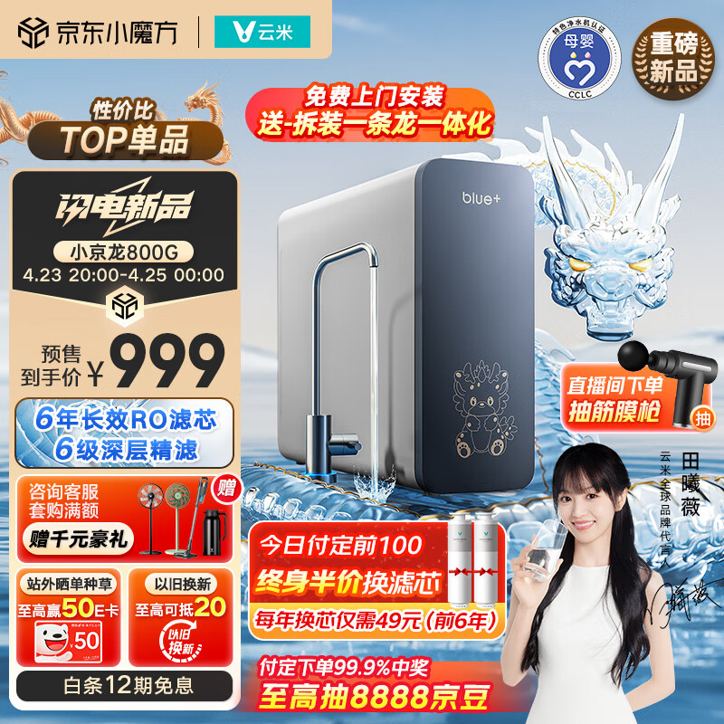 云米(VIOMI)净水器小京龙800G家用ro反渗透纯水机厨下式母婴直饮机大通量自来水双芯6级过滤器智能净水机价格:999.00元!