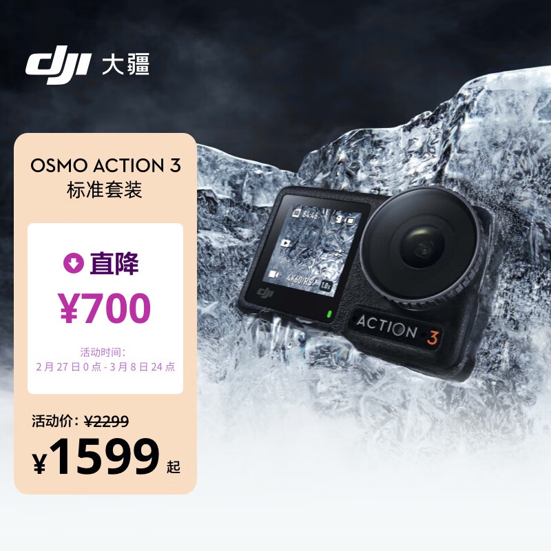 大疆 DJI Osmo Action 3 运动相机 4K高清防抖Vlog拍摄头戴摄像机 摄影滑雪耐寒水下相机+随心换2年版价格:1788.00元!