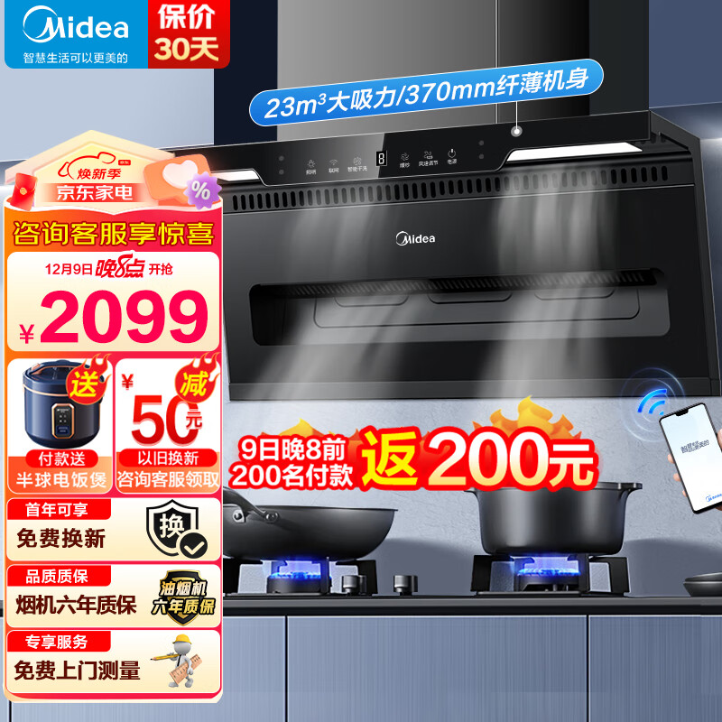 美的(Midea)顶侧双吸抽油烟机23立方大吸力自清洗家用吸油烟机双腔大风量厨房电器排烟机吸油烟机以旧换新DC2价格:2099.00元!