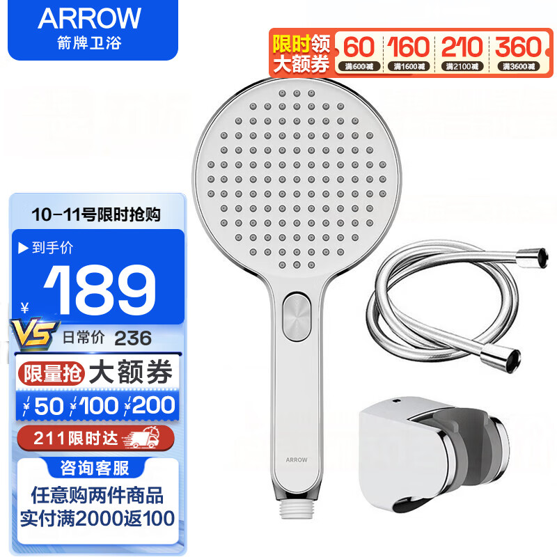 箭牌(ARROW)手持花洒套装增压宽屏超大加厚面板淋浴手持莲蓬头花洒喷头 增压加厚手持套装(圆形)价格:236.25元!