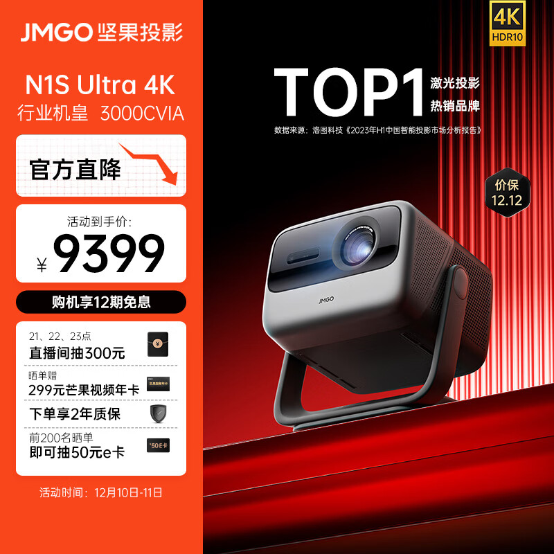 坚果(JMGO)N1S Ultra 4K超高清三色激光 云台投影仪家用家庭影院白天投墙(3000CVIA 4KHDR 1600:1对比度)价格:8729.00元!