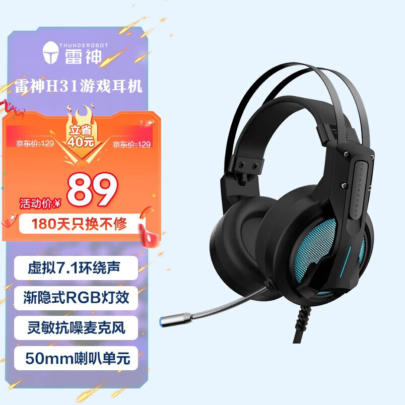 雷神(ThundeRobot) H31头戴式游戏耳机 有线电脑耳机带麦 电竞吃鸡耳机 虚拟7.1音效抗噪麦克风渐隐式RGB灯效价格:129.00元!