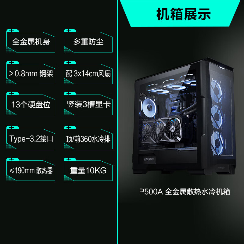 PHANTEKS追风者P500A黑中塔ATX台式nas多硬盘电脑水冷机箱(360水冷/3x140风扇/Type-C/支持4090显卡)价格:479.00元!