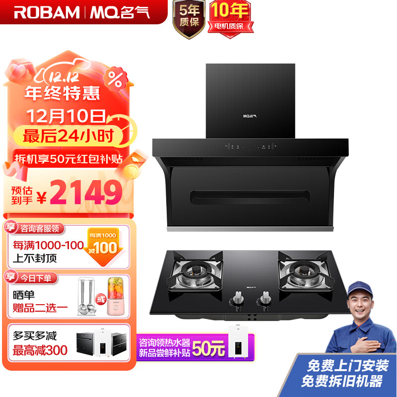 名气(MQ)老板抽油烟机家用7字型自适应灶具23大吸力顶侧双吸烟灶套装天然气A5505+6312BT价格:2149.00元!