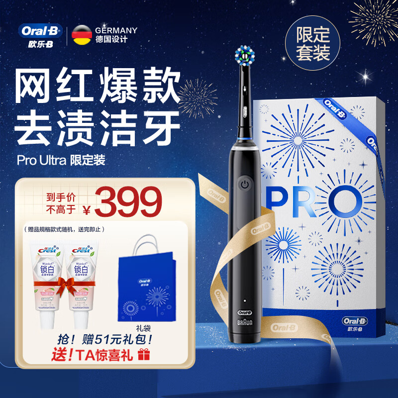 欧乐B成人电动牙刷Pro4Ultra武士黑礼盒3D声波圆头送男友送女友生日礼物母亲节礼物欧乐B黑武士520礼物价格:425.00元!