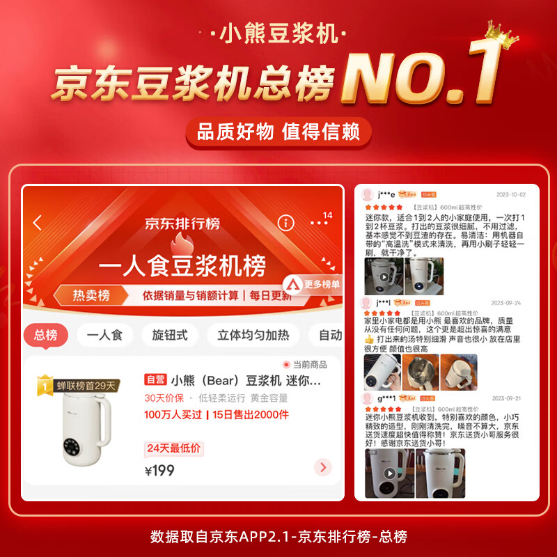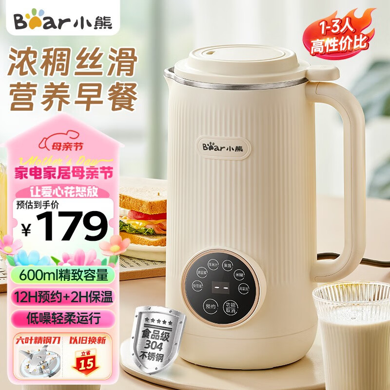 小熊(Bear)豆浆机 破壁机小型 家用小型米糊机 多功能全自动清洗免过滤 1-2人食 DJJ-D06X3 0.6L价格:179.00元!